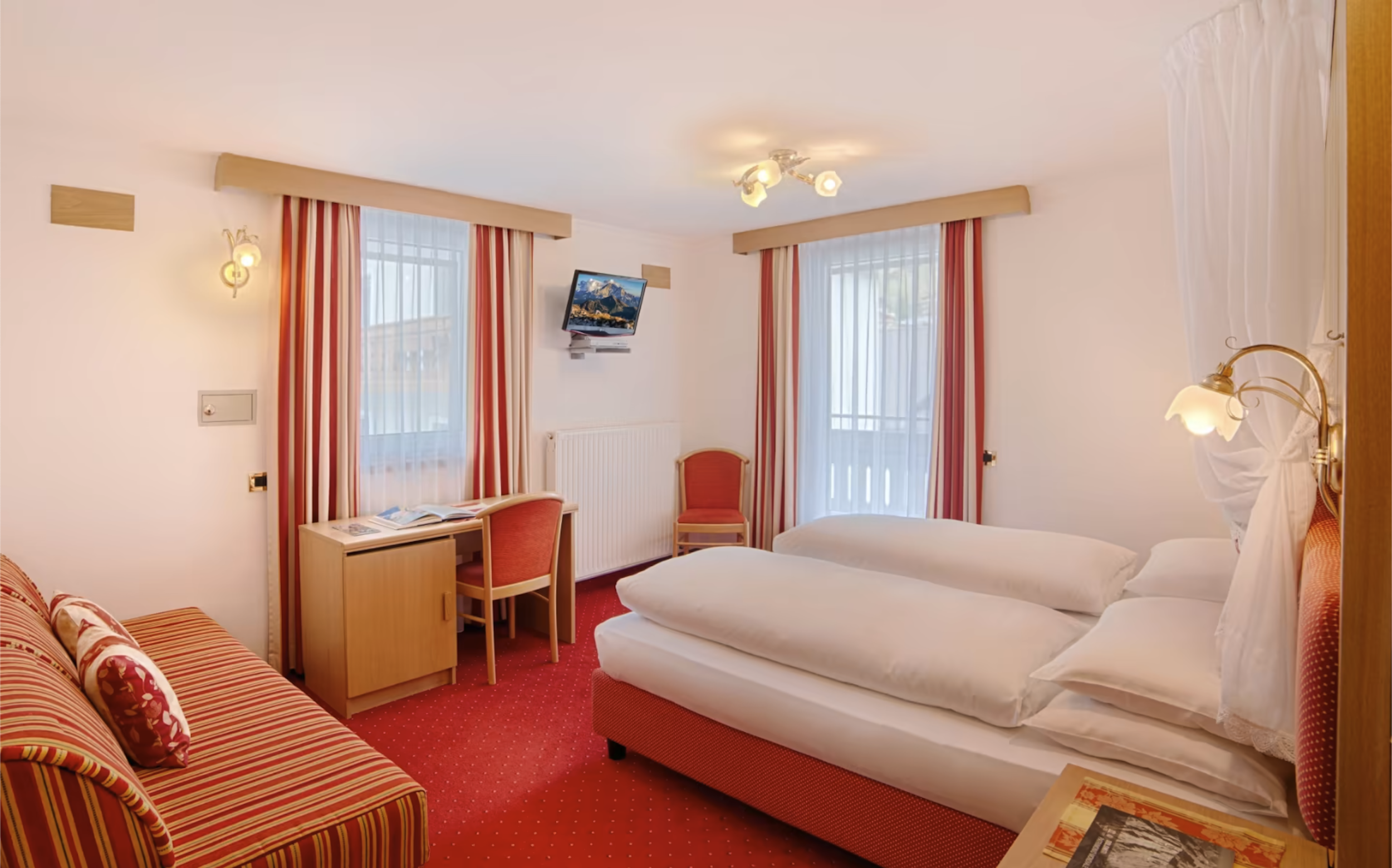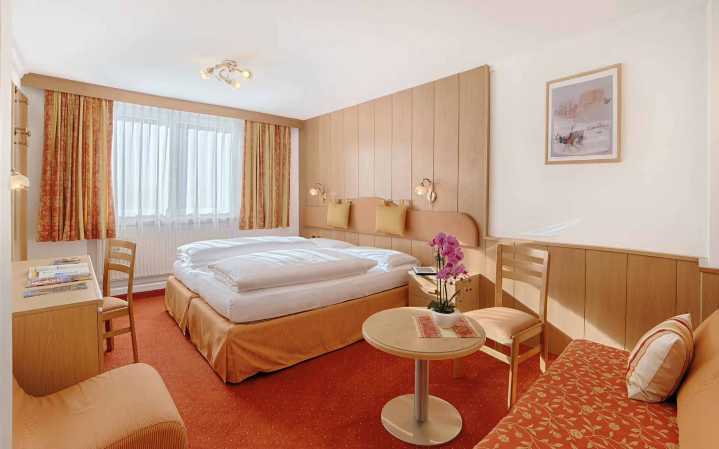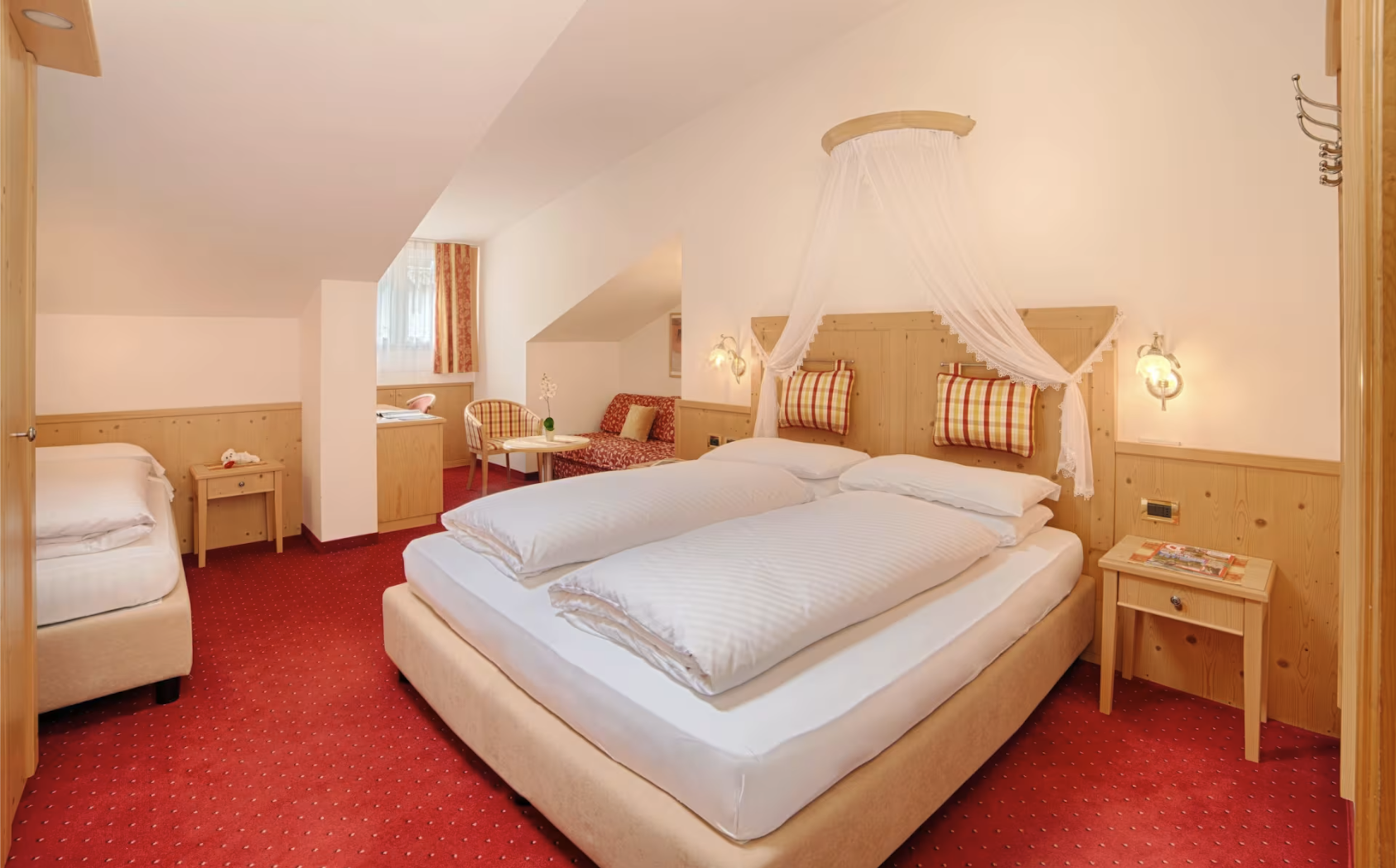 Hyggeligt og rummeligt værelse på cirka 25–26 m², komfortabelt indrettet med fyrretræ. Gulvet er belagt med tæppe. Værelset er udstyret med en dobbeltseng eller to enkeltsenge, en sovesofa med et lille bord samt et nyt badeværelse med regnbruser eller badekar, toilet, bidet og hårtørrer. Derudover er der et 43-tommers fladskærms-tv med satellitkanaler, Sky og radio.