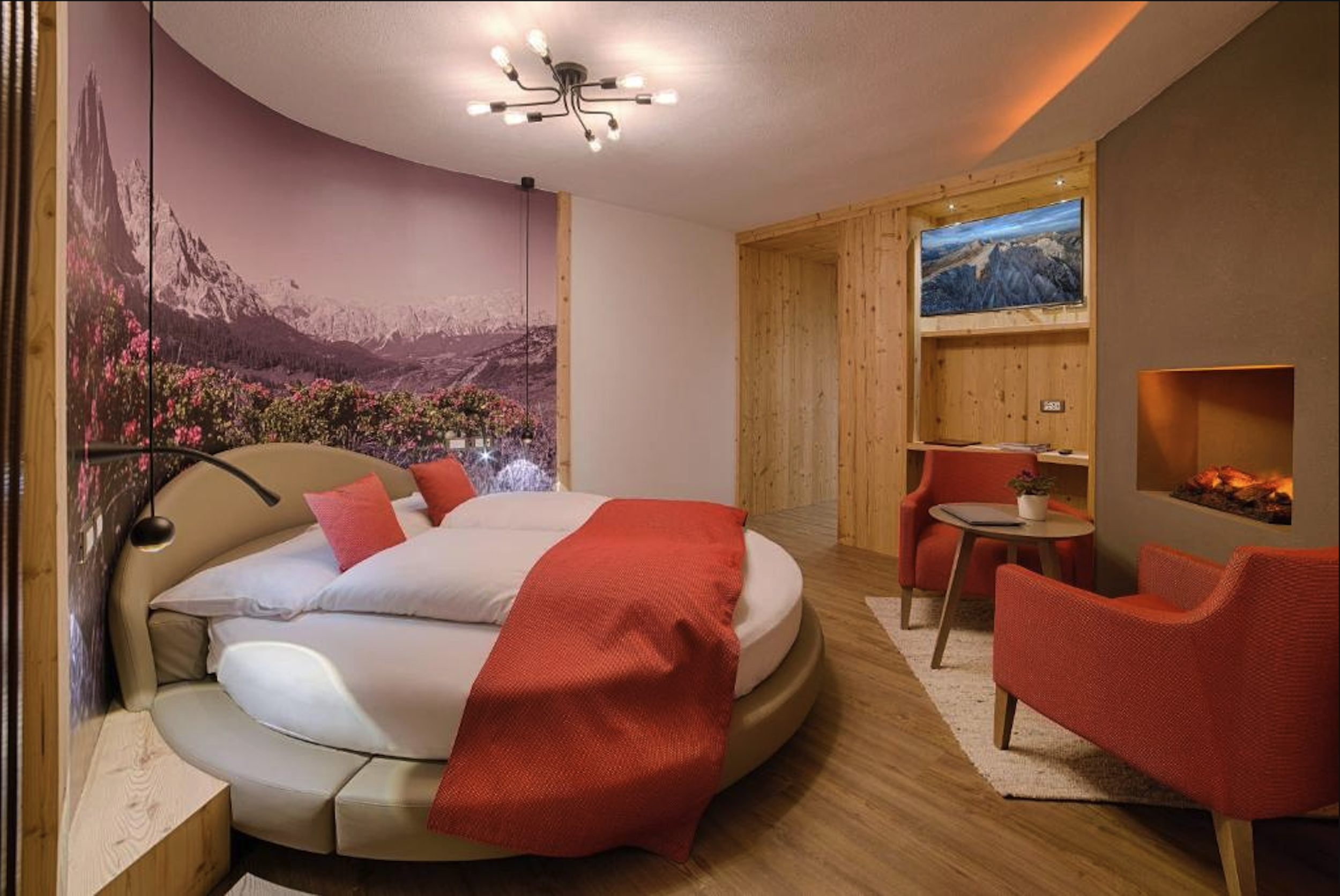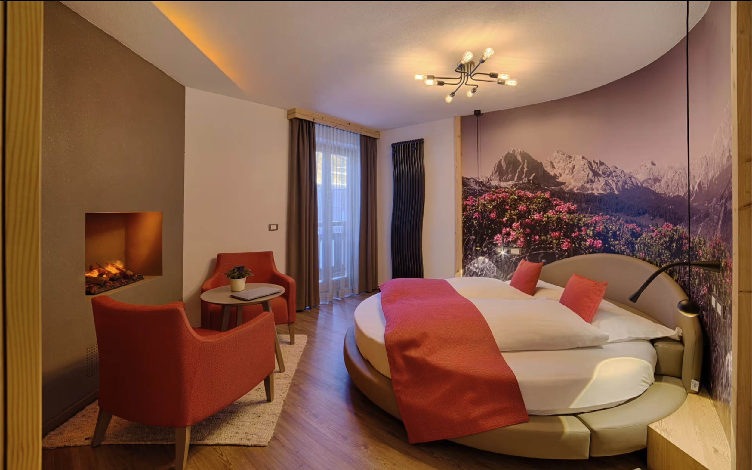 Rododendro-værelset er et af vores nyrenoverede værelser, omhyggeligt indrettet med børstet fyrretræ. Det er både hyggeligt og rummeligt med et areal på cirka 25 m² og har som noget helt særligt en rund seng og parketgulv. Værelset er udstyret med en rund dobbeltseng, lænestole med et lille bord, en elektrisk pejs samt et badeværelse med regnbruser, toilet, bidet og hårtørrer. Derudover er der et 43-tommers fladskærms-tv med satellitkanaler, Sky og radio samt bløde badekåber og tøfler.