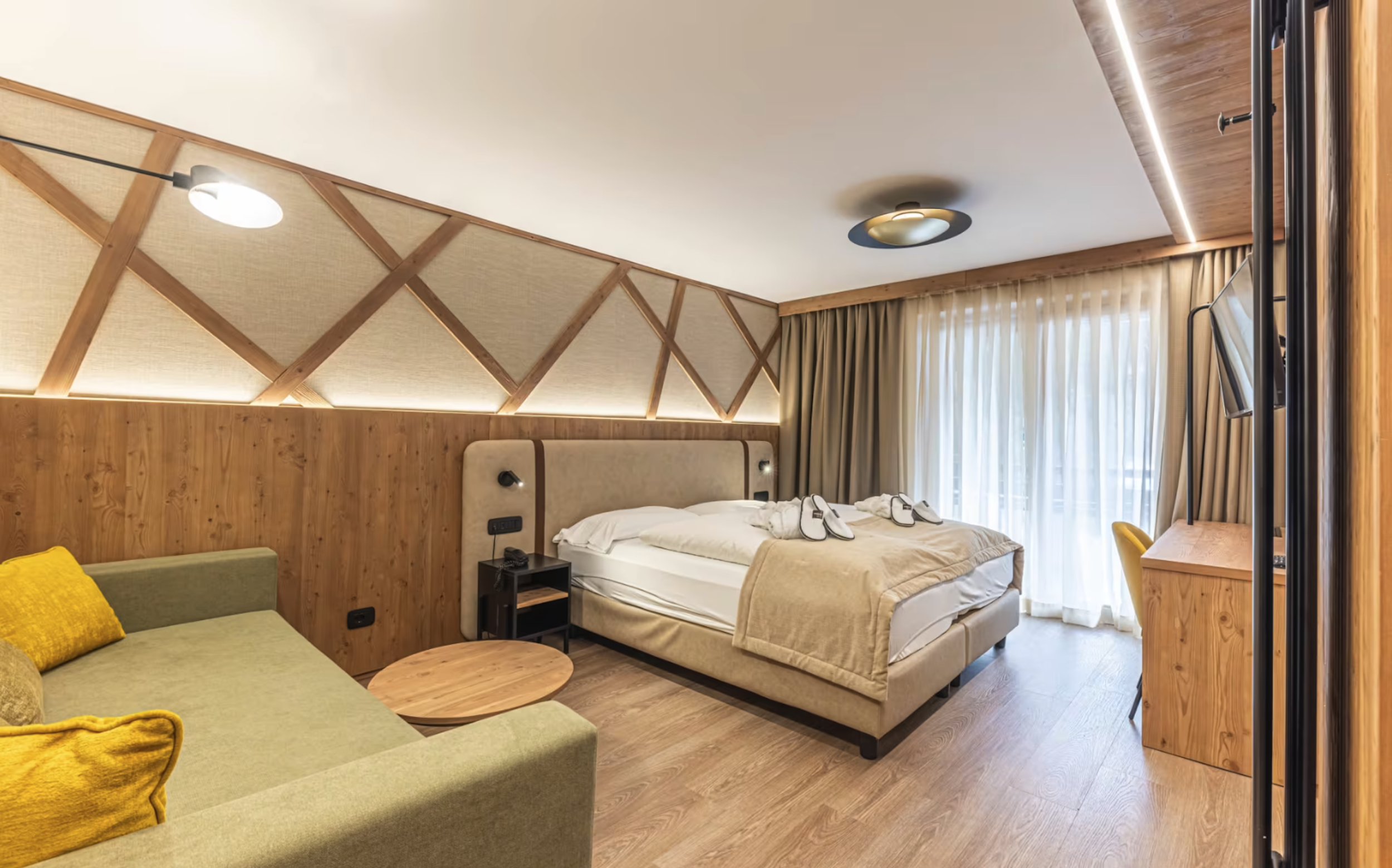 Et nyt og innovativt værelse på cirka 20 m², perfekt til dem, der søger en unik oplevelse i et kompakt rum med et raffineret design. Præget af den omsluttende varme fra schweizerfyr, udstråler dette værelse en intim og hyggelig atmosfære, ideelt for dem, der ønsker maksimal komfort i et eksklusivt miljø. Valget af fine materialer og opmærksomheden på detaljer gør hvert hjørne af værelset til en lille oase af ro. Gulvet er med parket.