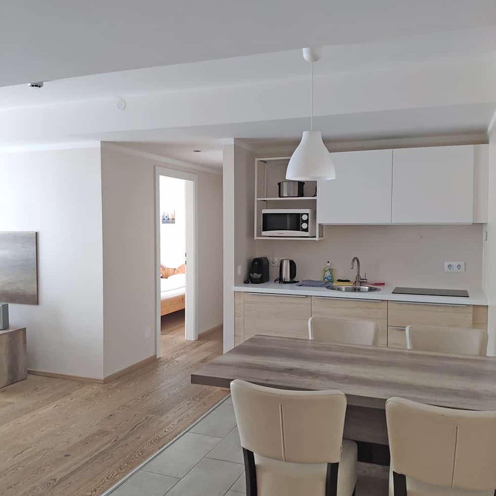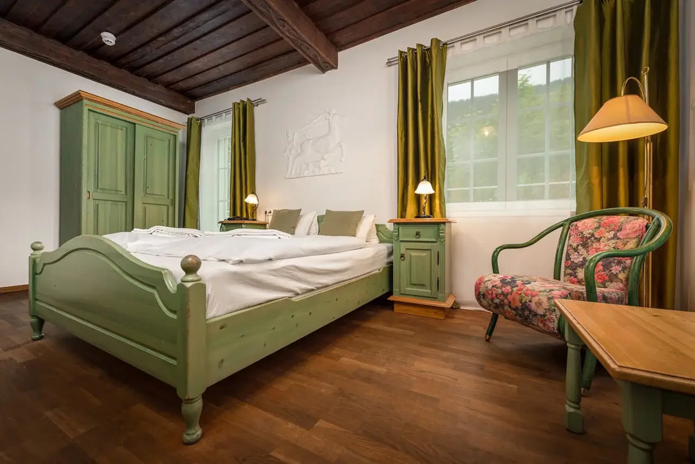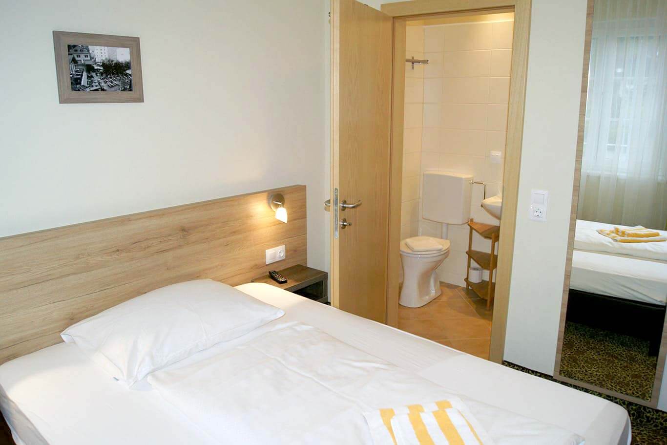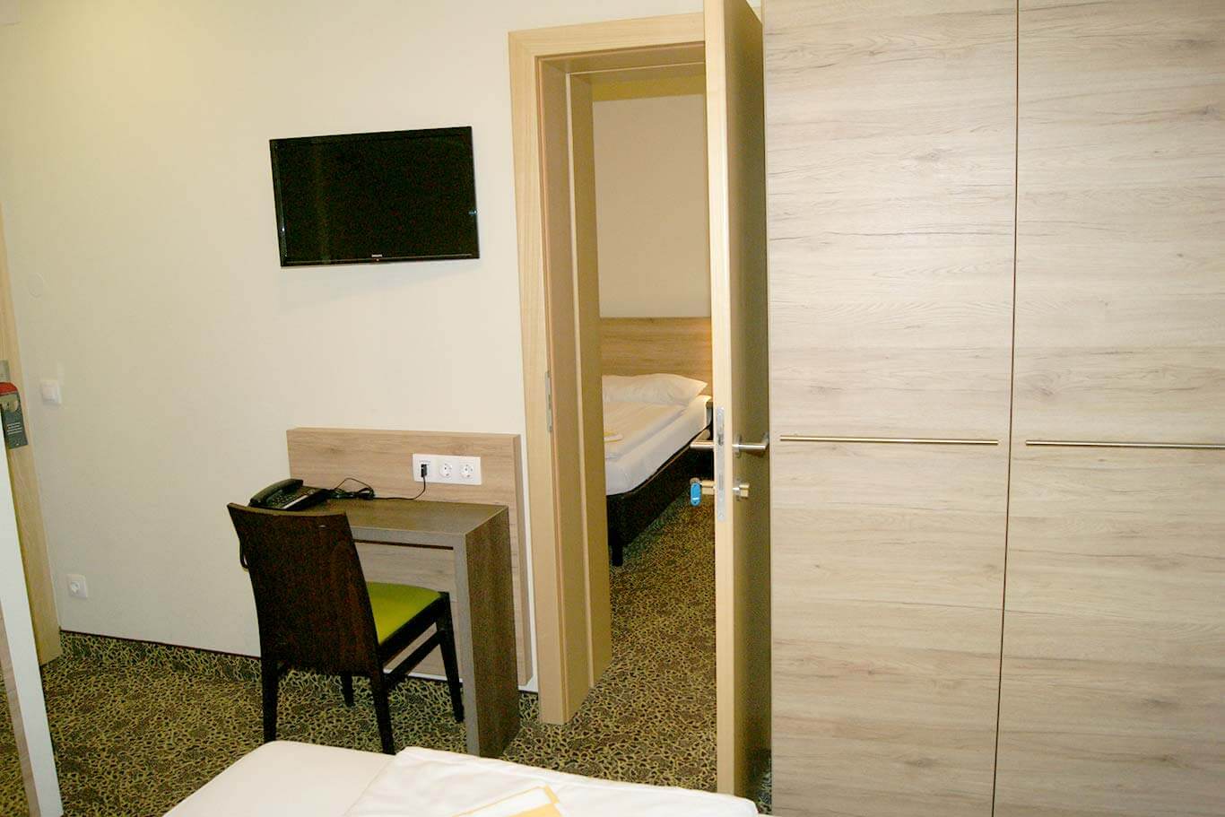 To sammenlagte værelser på 12kvm og 17kvm. Værelserne kan sepereres af en dør, hvilket gør værelset ideelt for familier, der ønsker samvær såvel som afslapning hver for sig, der er et badeværelse på gver værelse, wifi og tv.