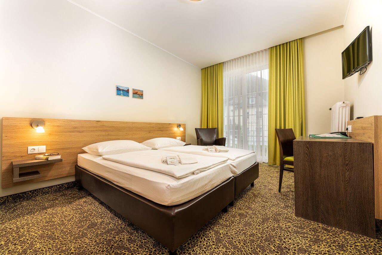 Lyst og rummeligt værelse med en stor dobbeltseng eller 2 enkeltsenge. Ved denne værelsestype er der enten balkon eller terrasse.
