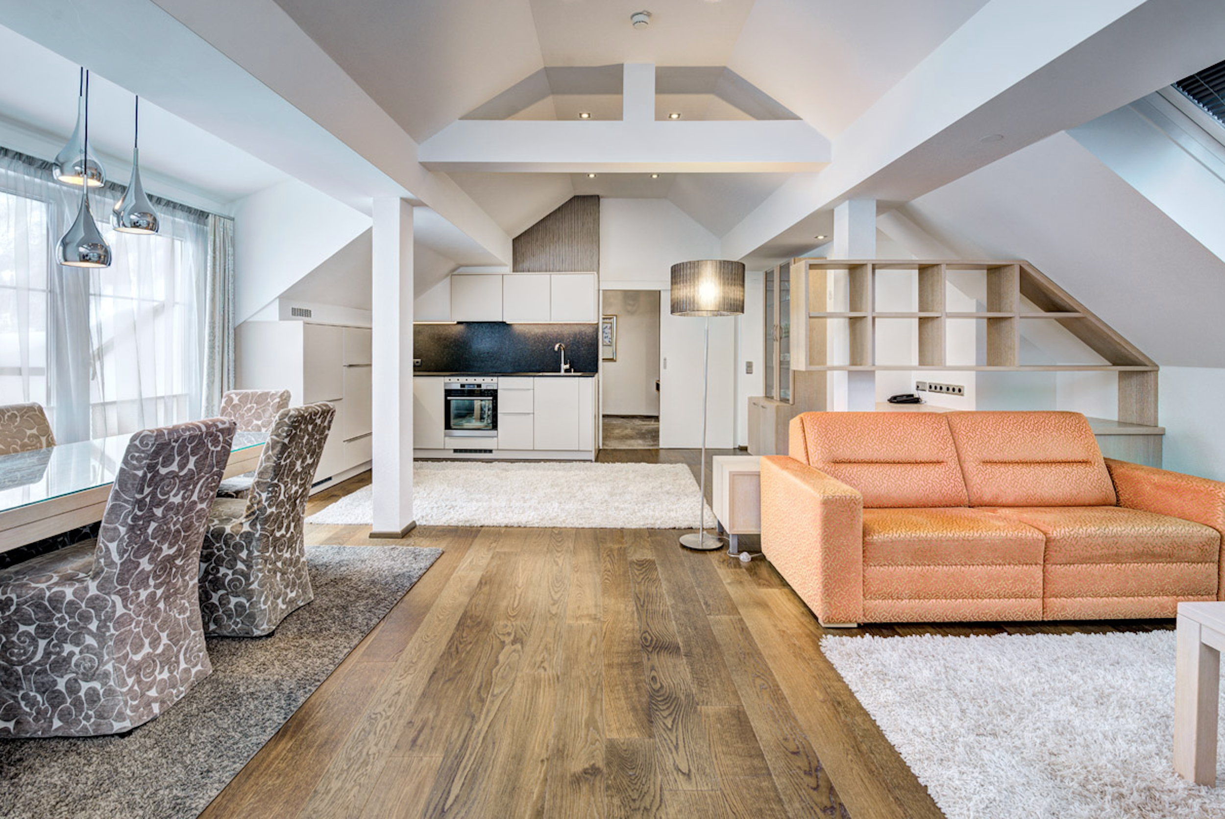 Moderne suite på 55m2 med et soveværelse med dobbeltseng og en rummelig stue med et mindre køkken. Værelset har egen balkon.