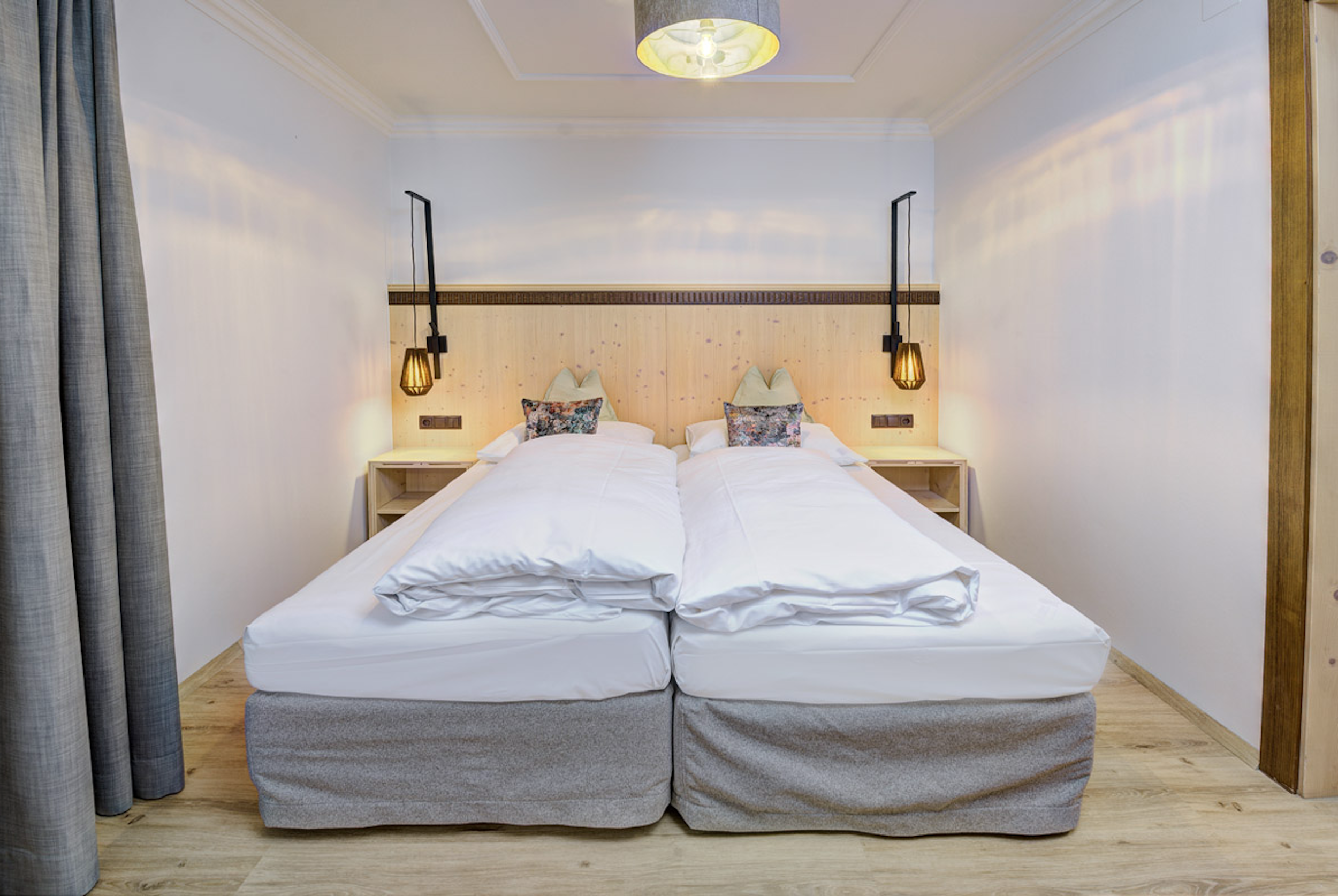 Lyst og rummeligt dobbeltværelse med en stor dobbeltseng eller 2 enkeltsenge og mulighed for en ekstra opredning. Værelset har egen altan med udsigt over Ischgl.