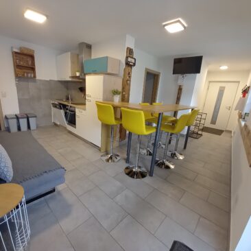 Lejligheden har et hyggeligt opholdsrum med køkkenafdeling og spiseplads til op til 8 personer. Køkkenet er udstyret med komfur, ovn, køleskab, mikroovn, kaffemaskine og elkedel. Her findes også sofaer, TV samt en stor balkon.