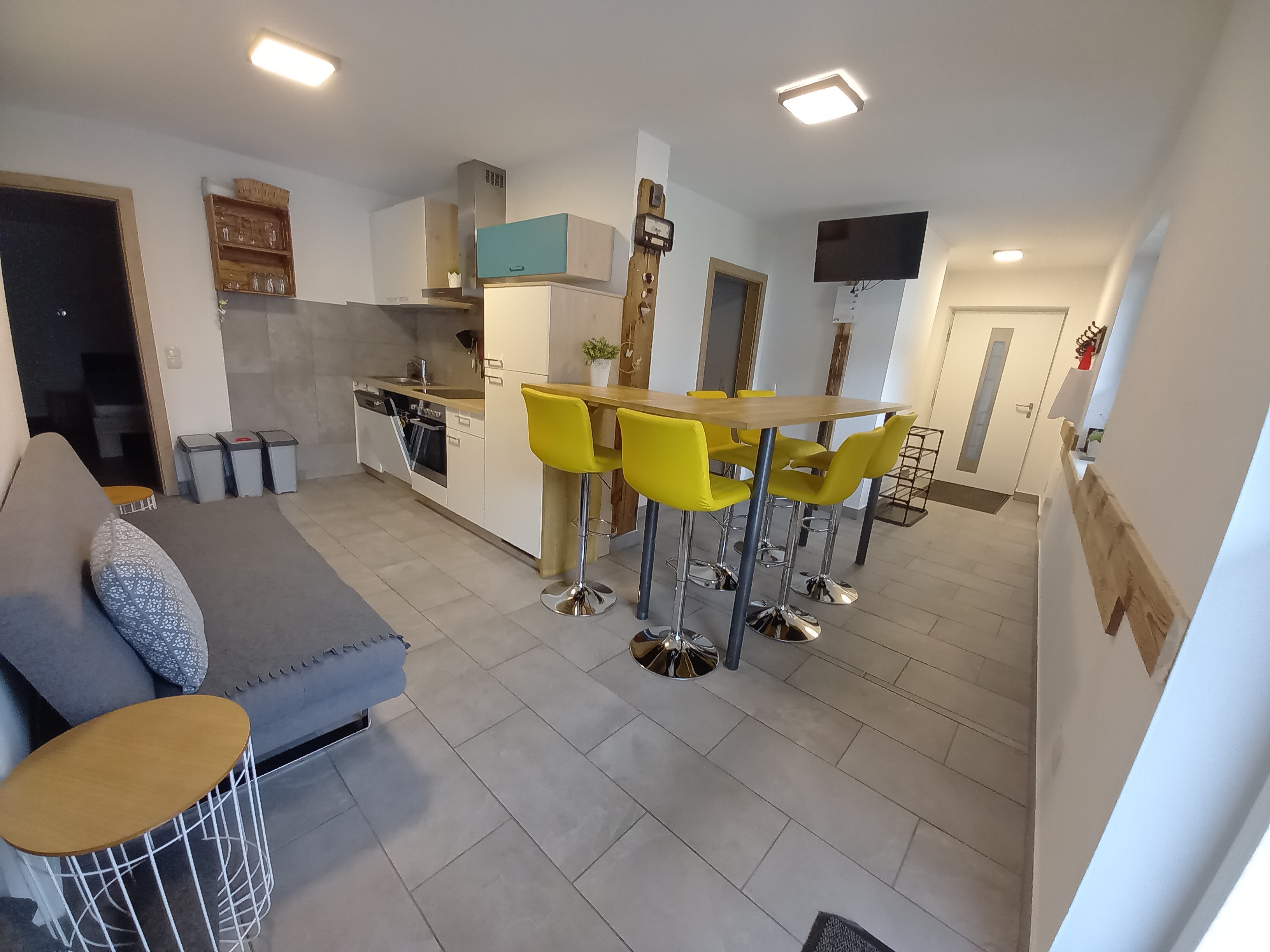 Lejligheden har et hyggeligt opholdsrum med køkkenafdeling og spiseplads til op til 5 personer. Køkkenet er udstyret med komfur, ovn, køleskab, opvaskemaskine, mikroovn, kaffemaskine og elkedel.