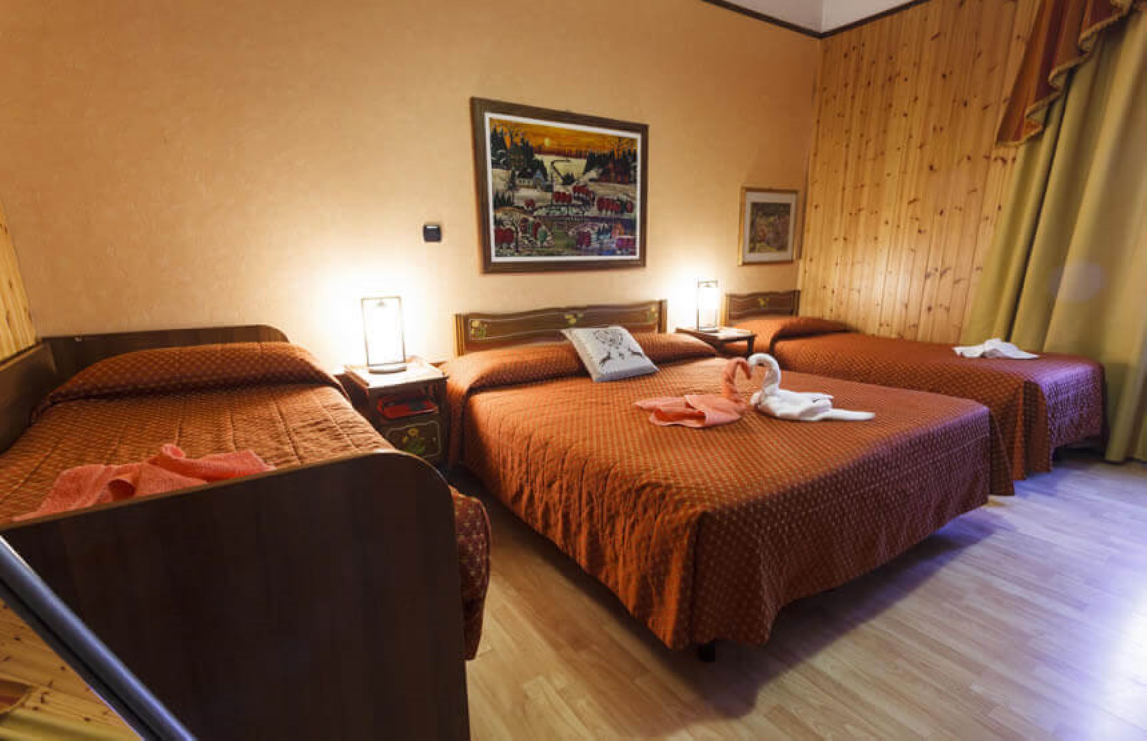 Familieværelset er ca. 20-24 m² og har plads til 2 voksne og op til 2 børn med ekstra enkeltsenge. Værelset er udstyret med tv, sikkerhedsboks, hårtørrer, gratis Wi-Fi og minibar. Det er indrettet i en varm træ- og alpestil. Badeværelset har bruser og toilet. Der er masser af plads til familiens behov i en hyggelig skihytte-stemning.