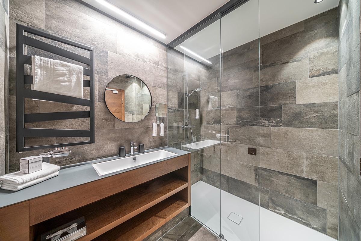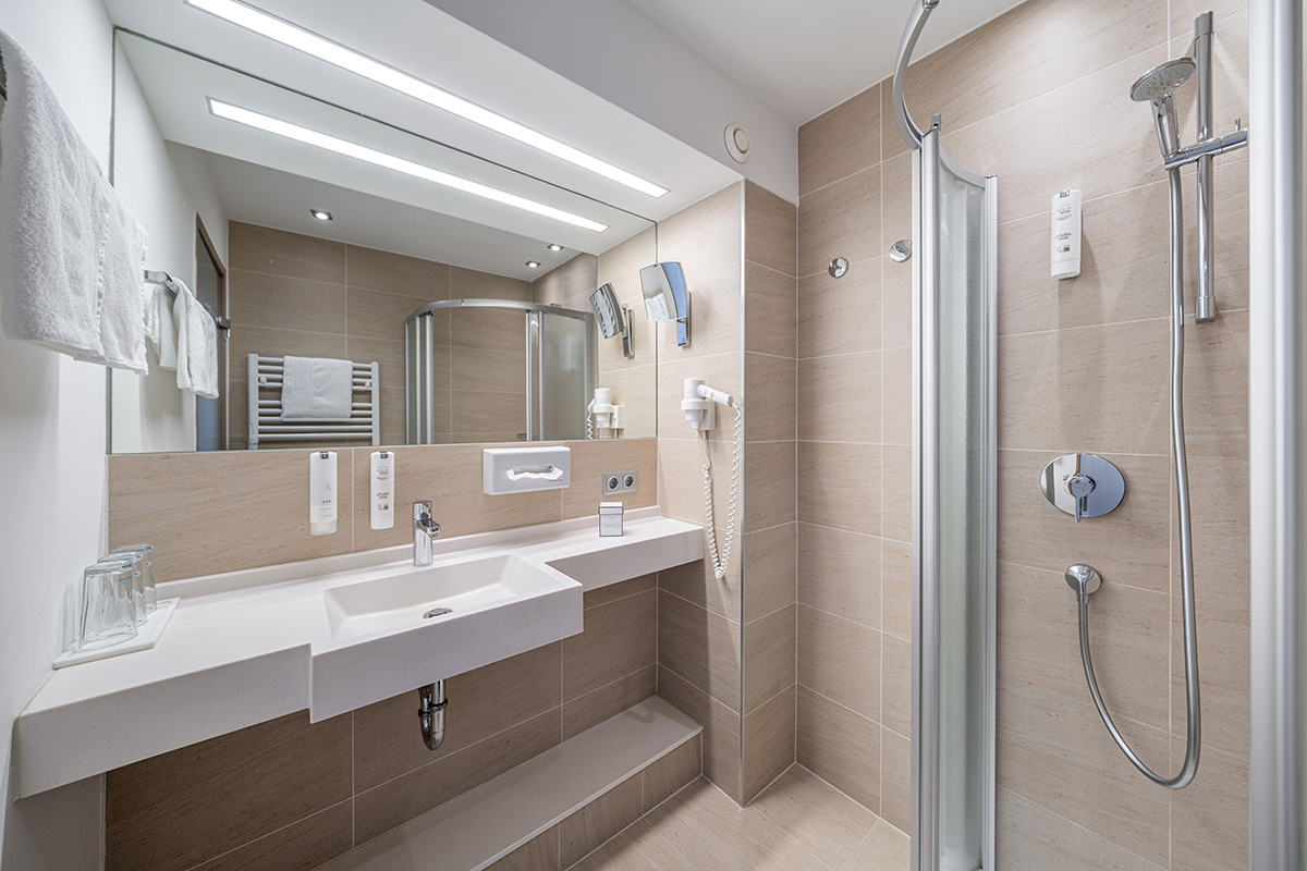 Badeværelse med brusebad og separat toilet, hårtørrer og makeup-spejl