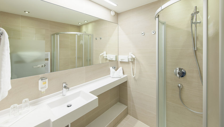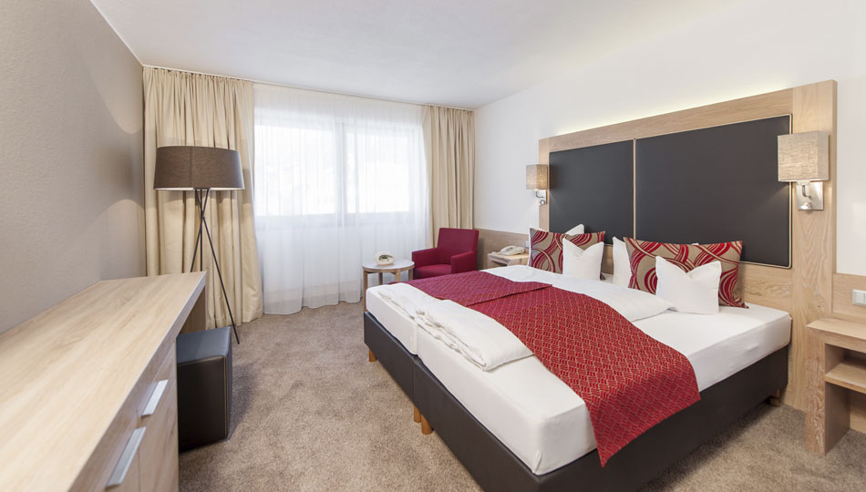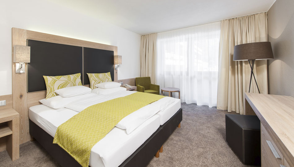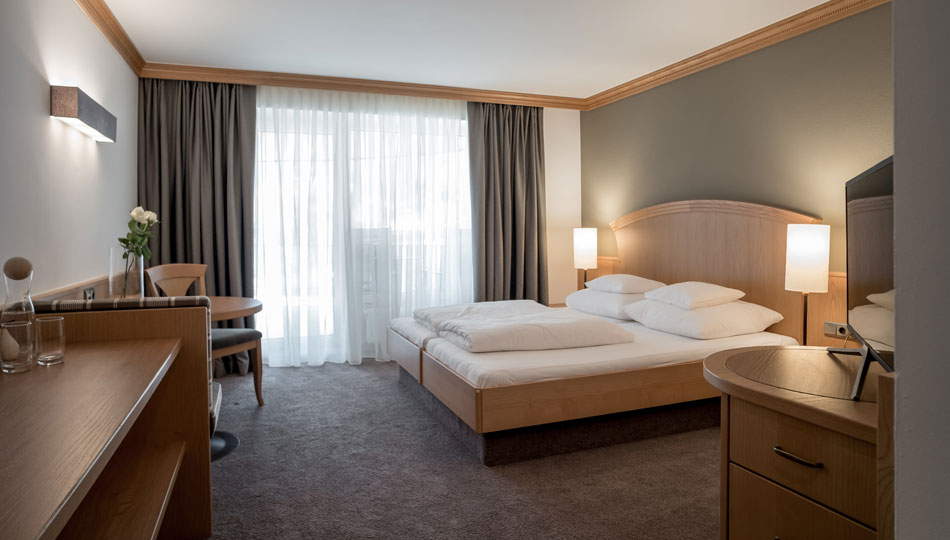 Værelse på ca 27m2 med eget badeværelse og balkon. Det er muligt at separere sengene. Værelset er med gulvtæppe