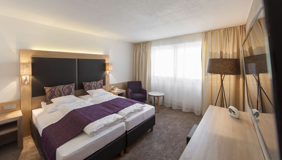 Værelse på ca 25m2 med eget badeværelse. Det er muligt at separere sengene. Værelset er med gulvtæppe