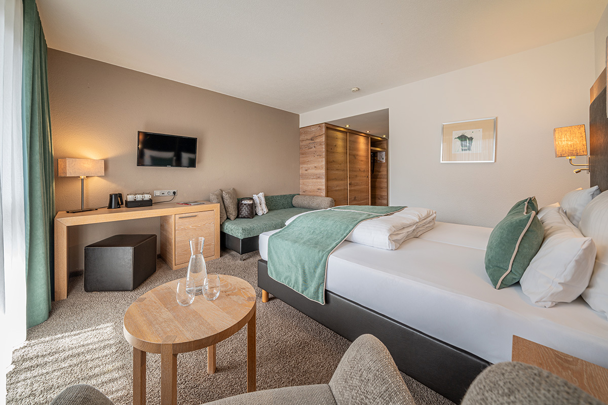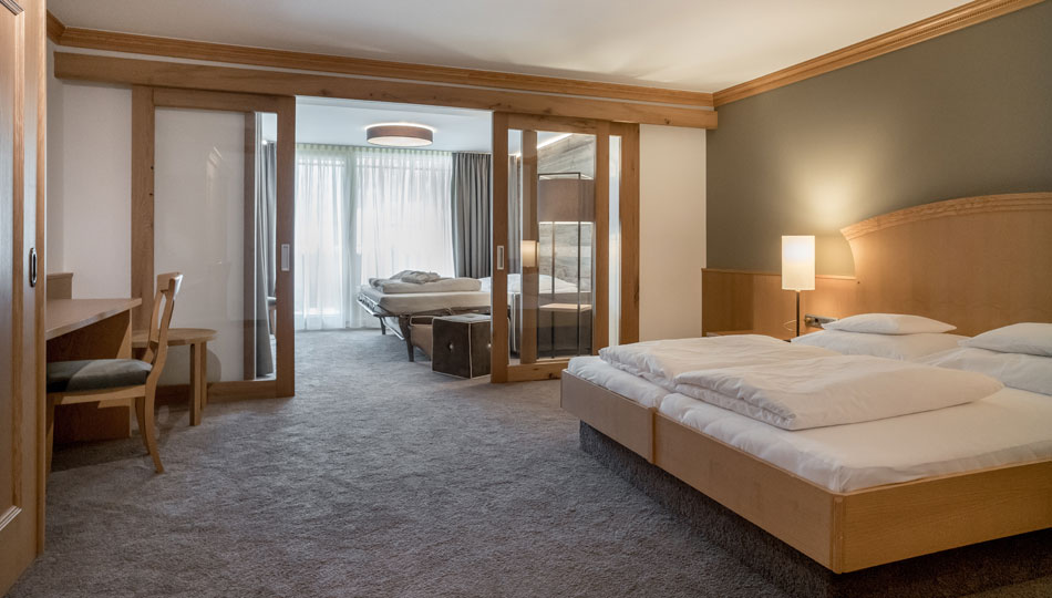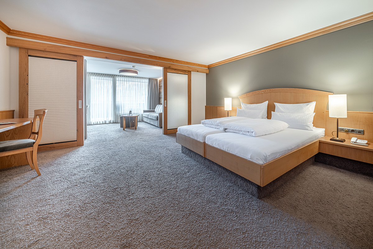 Hyggeligt familieværelse på ca. 46 m² til 3-4 personer. Værelset består af to separate rum, det ene med dobbeltseng og det andet med sovesofa. Skrivebord,