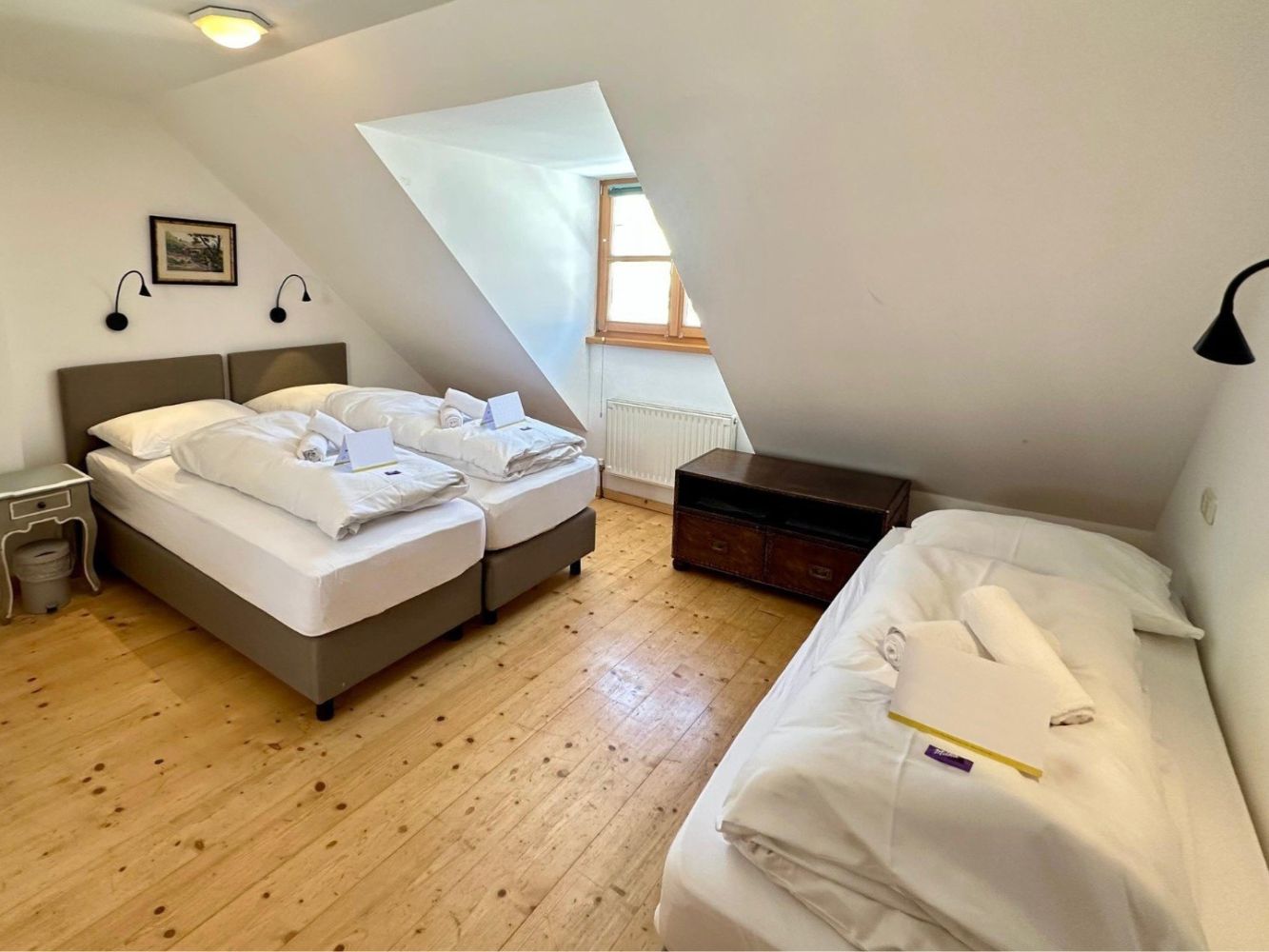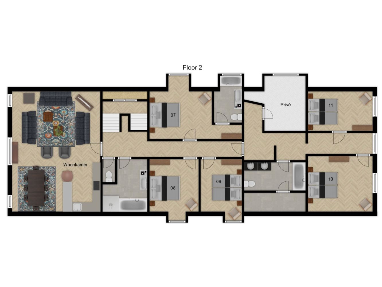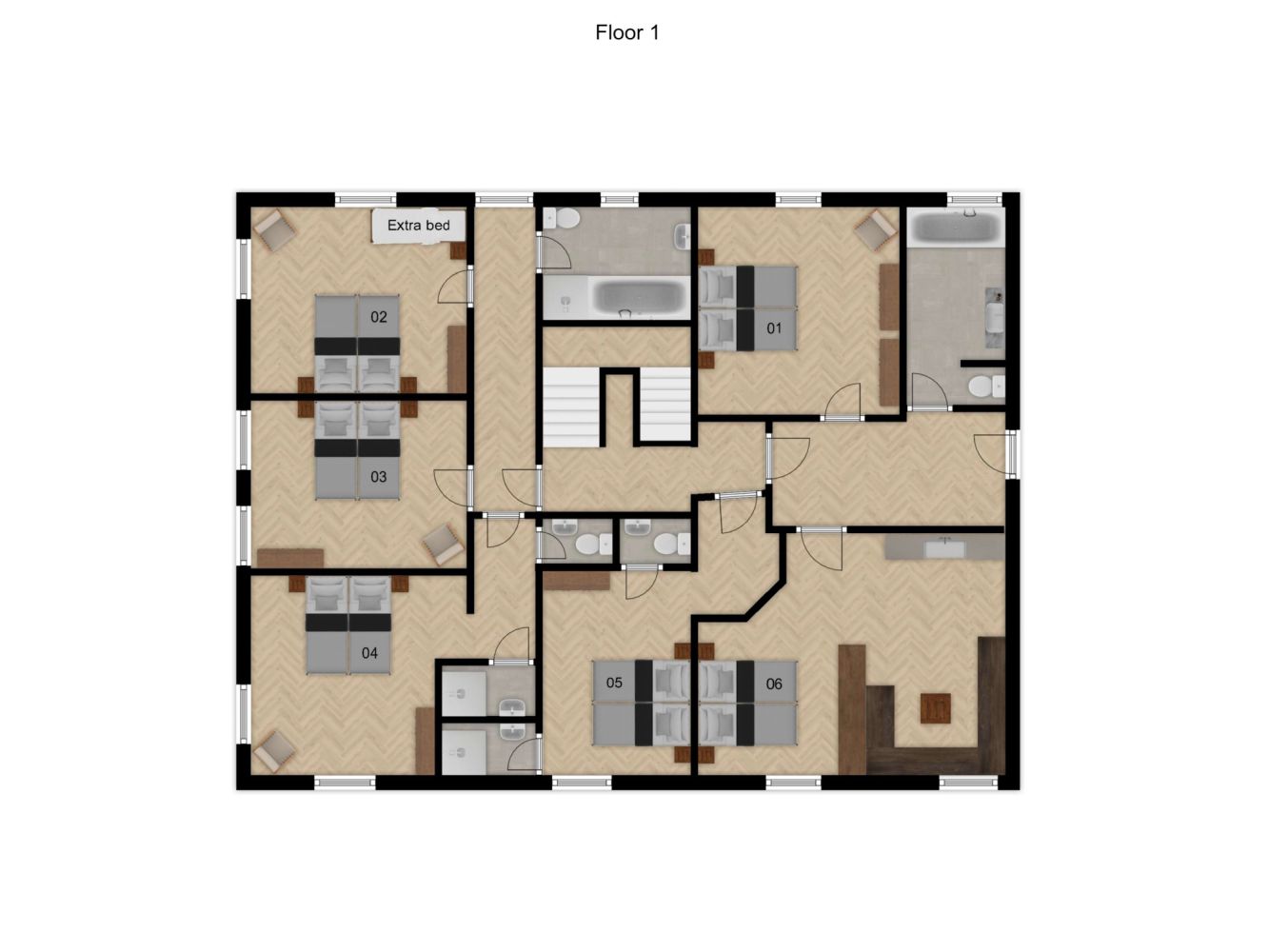 familier, vennegrupper eller firmaer. På første sal findes seks dobbeltværelser (et med mulighed for ekstra seng), mens øverste etage byder på yderligere fire dobbeltværelser samt et tremandsværelse.