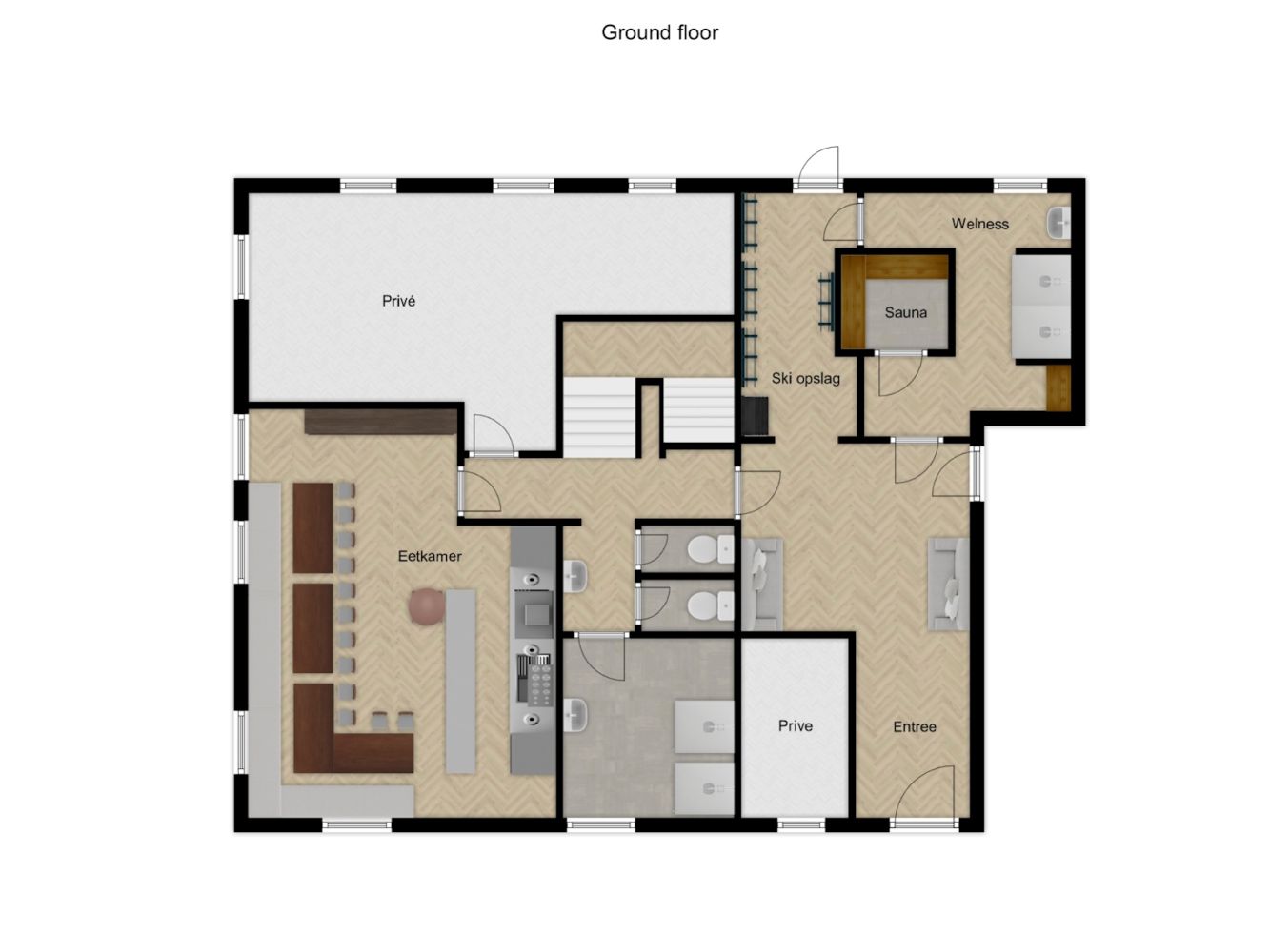 Wellness og praktiske faciliteterVed ankomst mødes du af en central entré med adgang til sauna og skirum, hvor udstyret nemt kan opbevares. Her er der tænkt på både komfort og funktionalitet under opholdet.