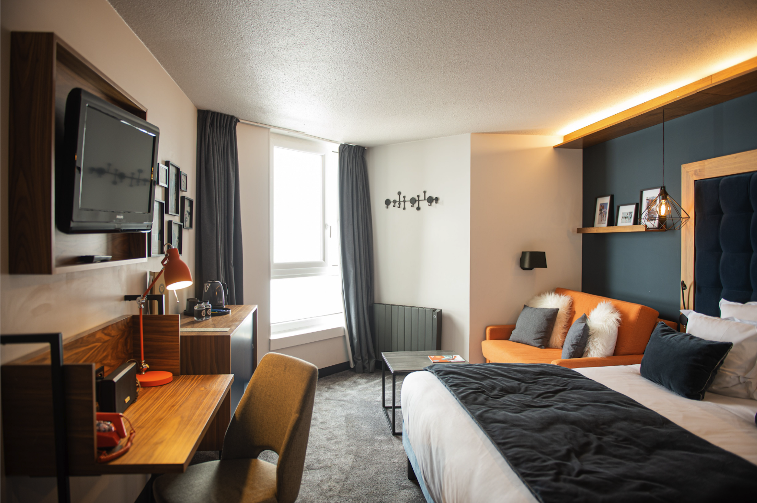 Moderne og flot dobbeltværelse på 23 m2 egnet til 2 personer. På værelset findes en dobbeltseng (180x200) eller to enkeltmands senge (90x200). Herudover er der indbygget klædeskab, Marshall højtaler, Nespresso maskine, og fjernsyn. Herudover findes der eget toilet med bad.