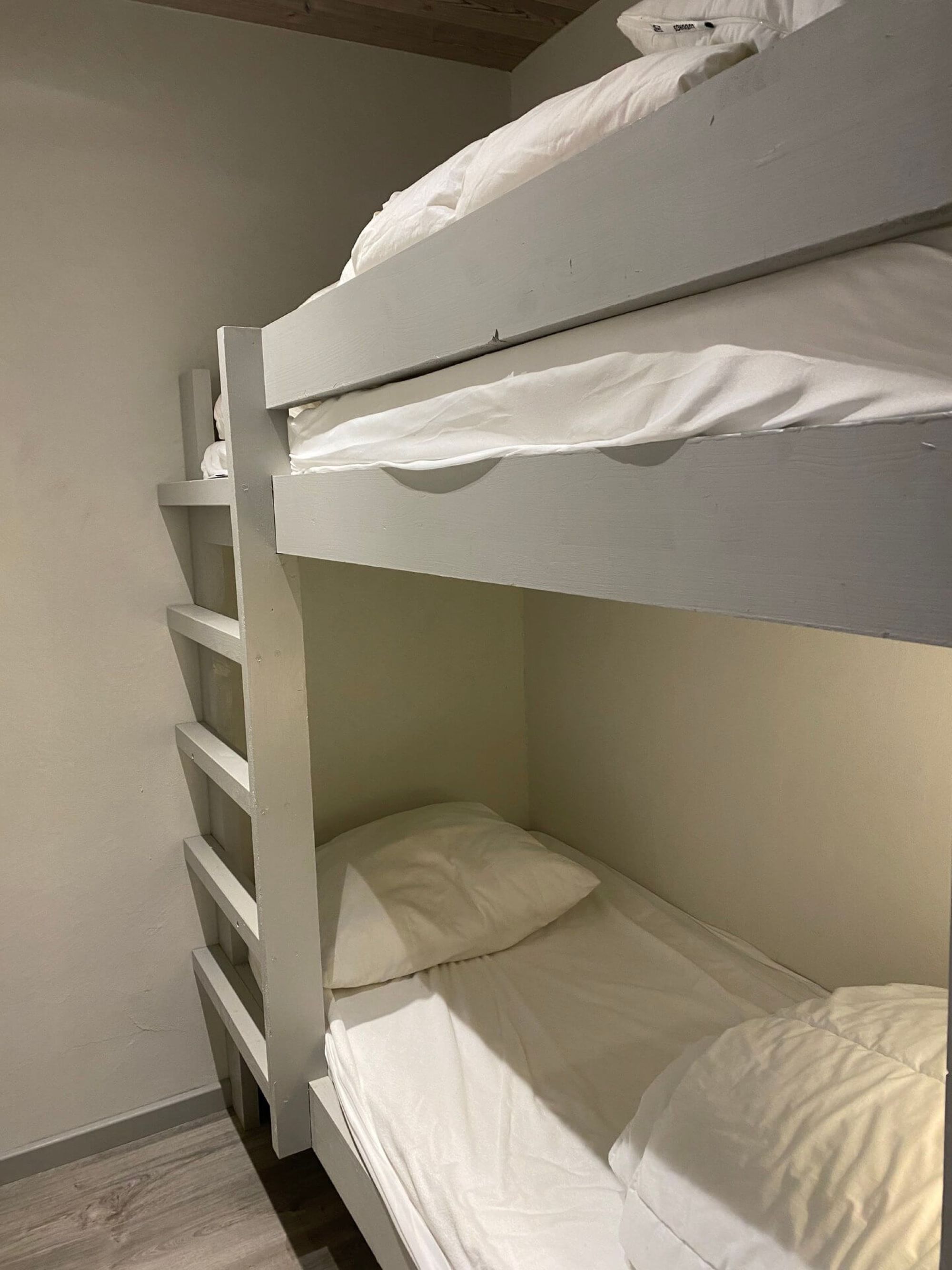 Lejligheden har køjesenge i et hjørne og en sovesofa i stuen, hvilket giver komfortabel plads til overnatning.