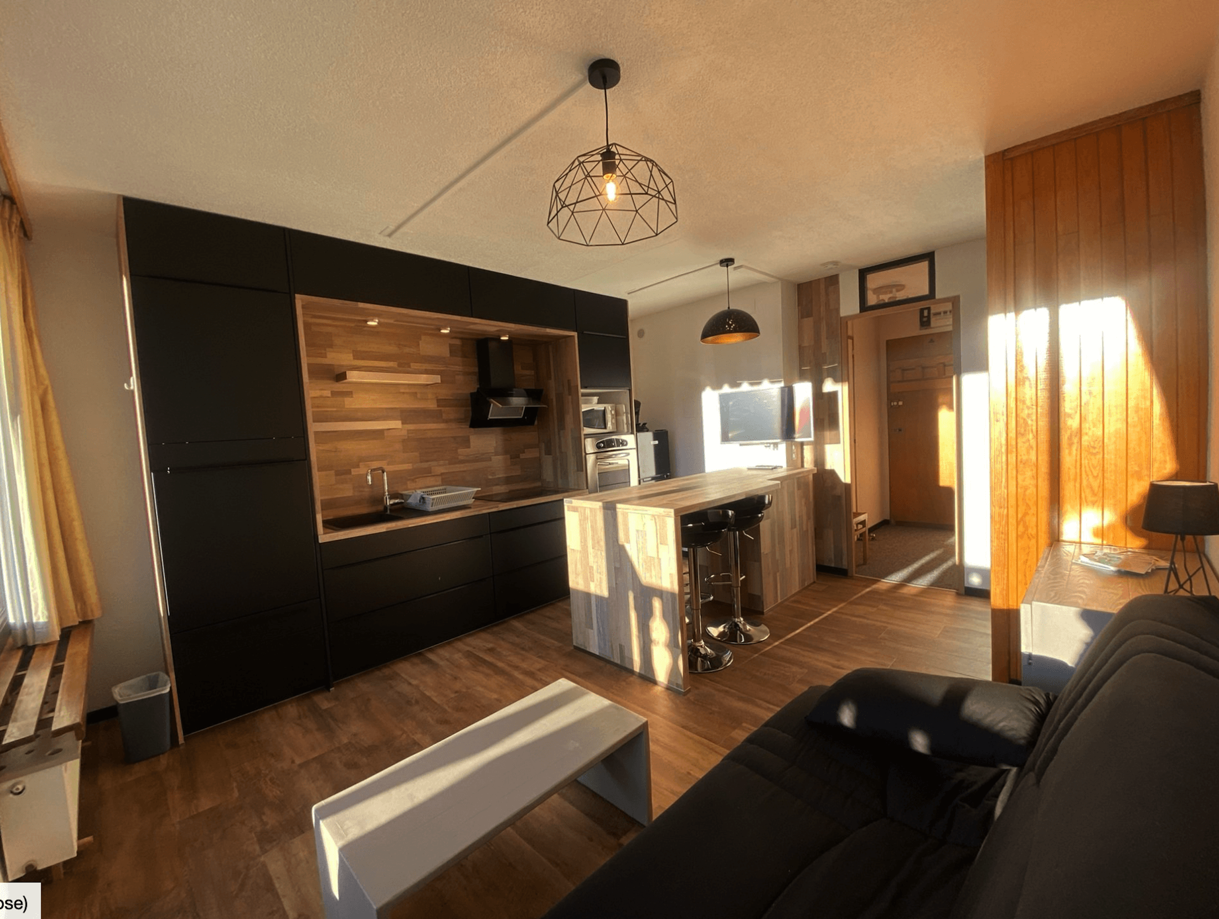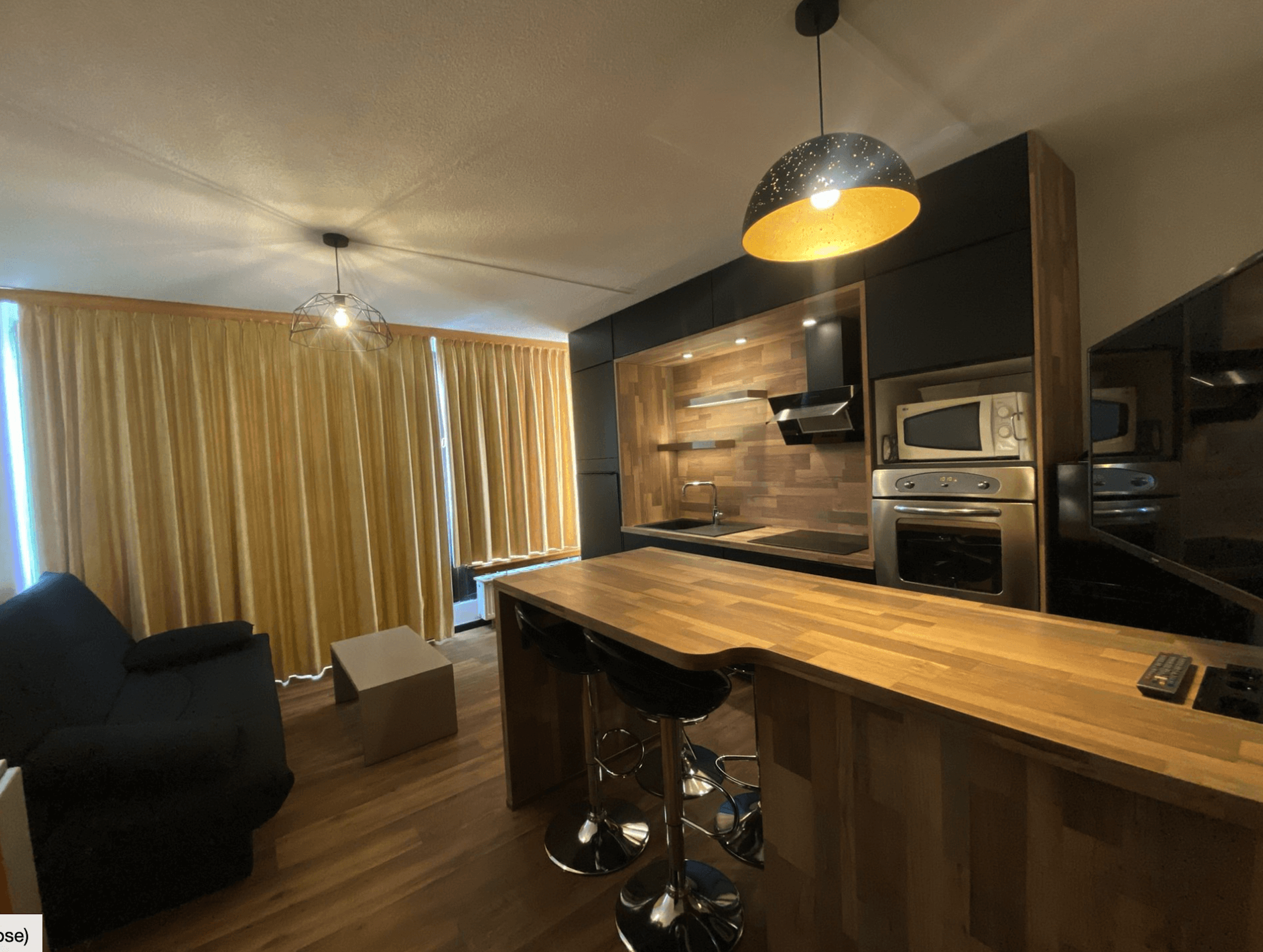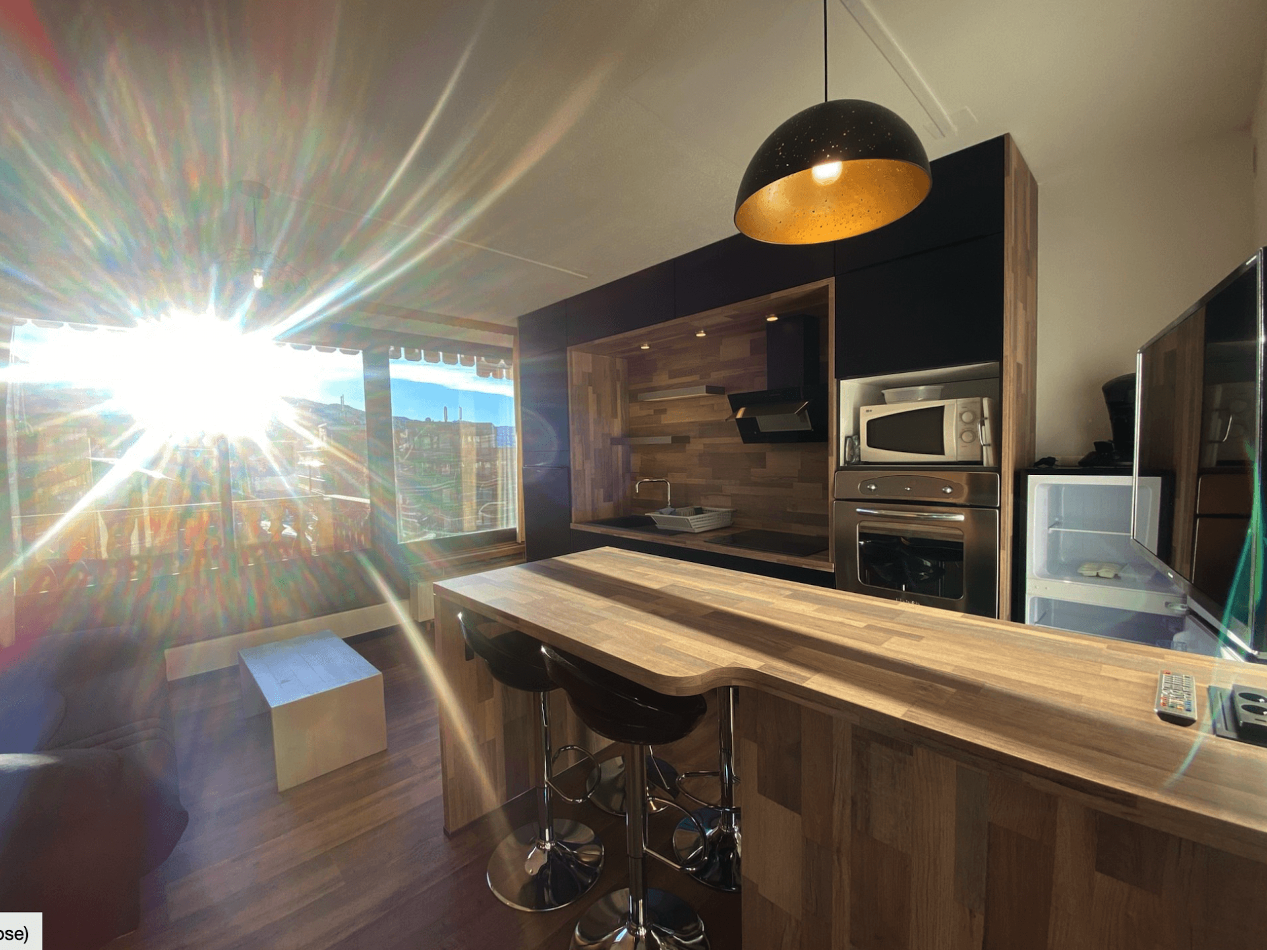 Denne charmerende 25 m2 studiolejlighed, belligende på anden sal, har gennemgået en komplet renovering i 2021 og byder på køjesenge i entréen, et badeværelse med toilet og en stue med et veludstyret køkken (ovn, mikroovn, opvaskemaskine, køleskab og kogeplader), en spiseplads med et højt bord og stole, en sovesofa og en sydvestvendt balkon med en vidunderlig udsigt over byen og bjergene.