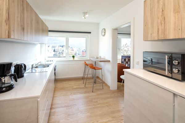 Lejligheden er ca 60m2 og har plads til op til 6 personer. Den består af to separate soveværelser: ét med dobbeltseng og ét med to enkeltsenge – begge med klædeskab. I stuen er der en sovesofa, som kan redes op som dobbeltseng, samt mulighed for mørklægning. Her er der god plads til afslapning efter en dag på bjerget.