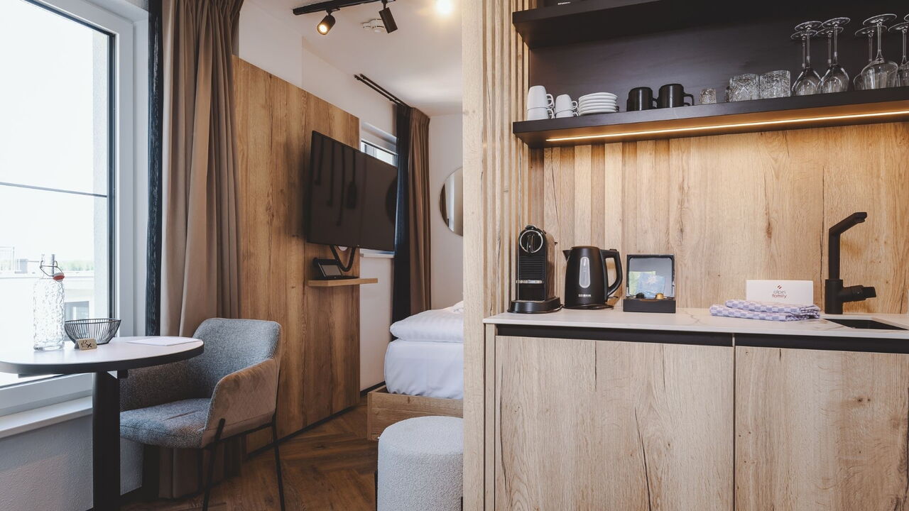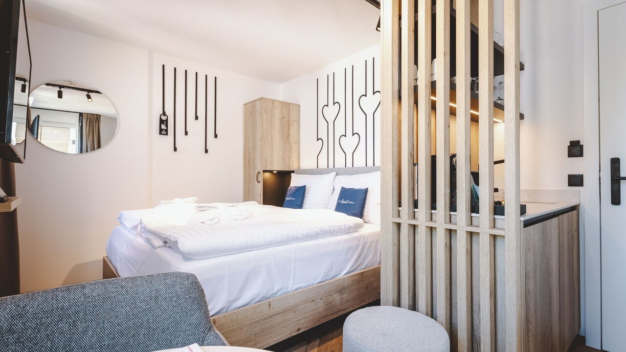 Classic Double Room har en komfortabel dobbeltseng. Ud over et badeværelse med bruser har værelset et tekøkken med bestik og service, en elkedel, en kaffemaskine, et køleskab og en balkon.